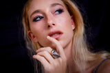 Seek peace, calmness, spirituality and balance in life wearing our uncanny deep ocean casual ring. Featuring a classic asymmetric design, real blue gemstone carved and embellished into an eternity ring band, the mysterious long ring boosts a mesmerizing sensation to your outlook. One of the most fascinating additions to Silver Maimon jewelry collection.