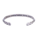 Inspirational and Delightful! You’ll feel empowered in life wearing this inspiring adoinis cuff bracelet. Featuring an asymmetric lines pattern, sleek inner surface with engraving ("are you seeking freedom, money, power?"), this subtle bangle bracelet makes a motivational addition to your wardrobe.