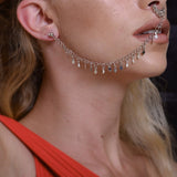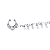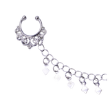 Streamlined and Seductive! The classic silver nose chain features a unique chain pattern inspired by the vintage Bohemian tribal jewelry. Having a half-open septum ring at one end and fine pin stud on the other, this unblemished ear to nose chain offers a traditional Boho chic look.